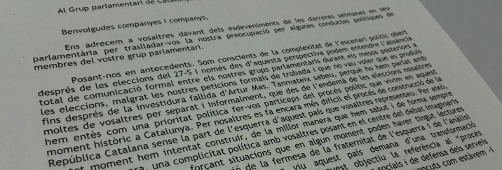 Posant-nos en antecedents. Som conscients de la complexitat de l’escenari polític obert després de les eleccions del 27-S i només des d’aquesta perspectiva podem entendre l’absència total de comunicació formal entre els nostres grups parlamentaris durant els mesos posteriors a les eleccions, malgrat les nostres peticions formals de trobada i que no vau voler que es produís fins després de la investidura fallida d’Artur Mas. Tanmateix sabeu, perquè ho hem parlat amb moltes de vosaltres per separat i informalment, que des de l’endemà de les eleccions nosaltres hem entès com una prioritat política fer-vos partíceps del procés polític que vivim en aquest moment històric a Catalunya. Per nosaltres es fa encara més difícil el procés de construcció de la República Catalana sense la part de l’esquerra d’aquest país que vosaltres representeu. Per això, en tot moment hem intentat construir, de la millor manera que hem sabut i de forma sempre honesta i de cara, una complicitat política amb vosaltres posant en el centre del debat imaginaris i relats que compartim, forçant situacions que en algun moment poden haver tingut lectures absurdes, però des de la convicció de la fermesa de la fraternitat de l’esquerra i de l’anàlisi compartida que l’emergència social que viu aquest país demana d’una transformació absolutament urgent. Són exemples explícits d’aquest objectiu la referència al “procés constituent no subordinat” de la declaració del 9-N, els annexos socials i de defensa dels serveis públics de la declaració i la votació separada de tots els seus punts, convençuts com estàvem –i estem- de l’existència d’importants horitzons polítics comuns entre nosaltres.