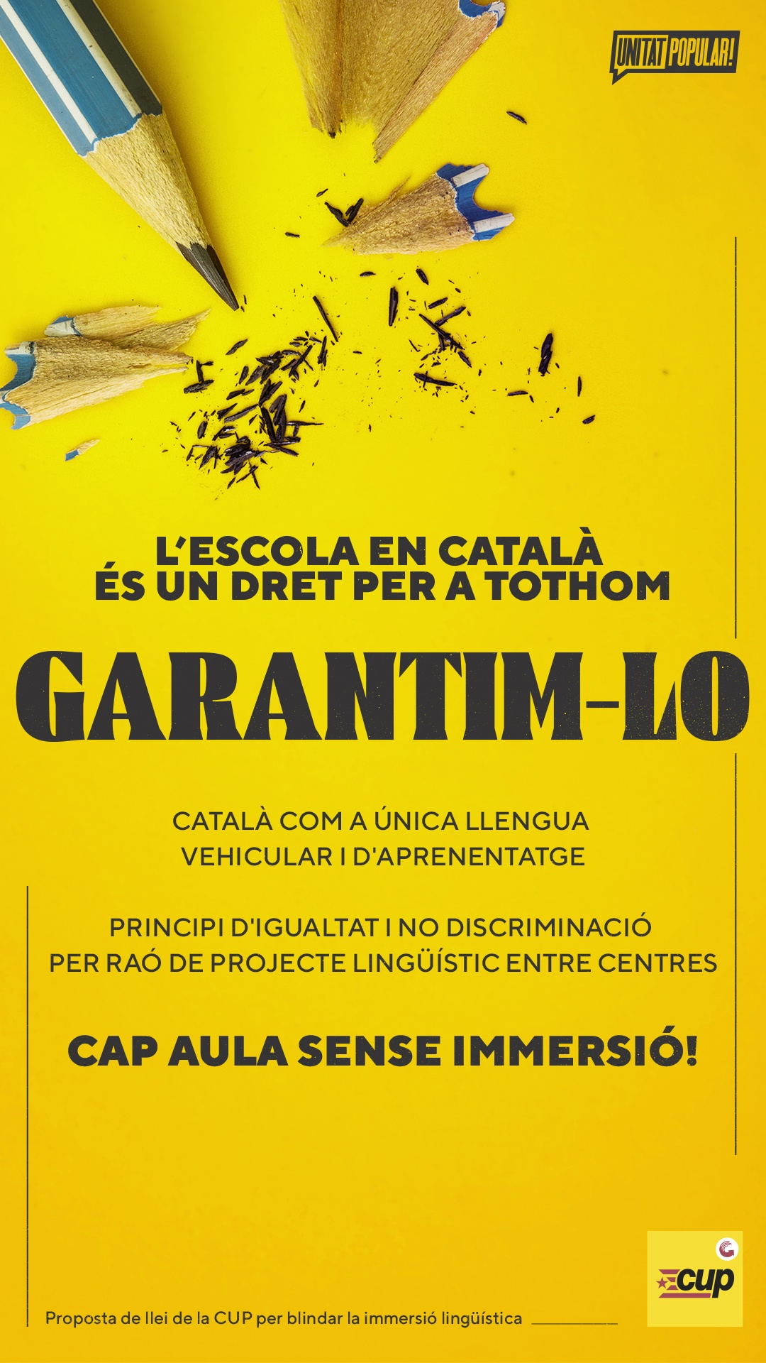 Davant l’immobilisme del govern de la Generalitat, que ha deixat soles les direccions dels centres fent front a l’atac del poder judicial i organitzacions contràries a la immersió lingüística i davant l’èxit de la vaga i les protestes de la comunitat educativa avui, la formació anticapitalista ha entrat a registre una proposició de llei de modificació de l’article 14 de la Llei 12/2009, del 10 de juliol, d’educació, que blinda la immersió lingüística i afirma el català com a única llengua vehicular i fa complir el principi d’igualtat i no discriminació per raó de projecte lingüístic entre els centres educatius.