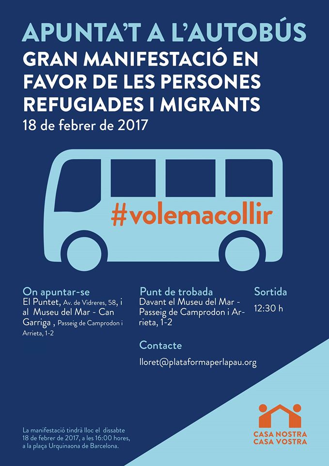 La Plataforma per la Pau Lloret, amb la col·laboració de l’Ajuntament de Lloret, organitza un autobús per la gent que vulgui assistir a la gran Manifestació per a les Persones Refugiades que es farà el proper 18 de febrer a Barcelona. Podeu reservar la plaça a El Puntet i al Museu del Mar (places limitades).