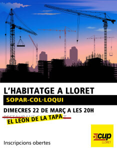 Exposició d’informe de la situació actual. Sopar-debat sobre com encarar l’habitatge a Lloret des de les institucions. Convocatòria és oberta a la militància i activistes en la lluita per a
